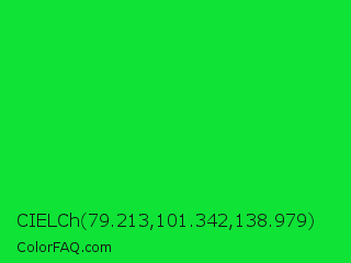 CIELCh 79.213,101.342,138.979 Color is a normal green color and the nearest color is Vivid Malachite #00cc33. Hex code #0ee336 and RGB value is rgb(14,227,54). In RGB color space, this color is composed of 5% red, 89% green, 21% blue, In CMYK color space, this color is composed of 94% cyan, 0% magenta, 76% yellow , 11% black , In HSL color space, this color has a hue angle of 131° , 88% saturation and 47% lightness.
