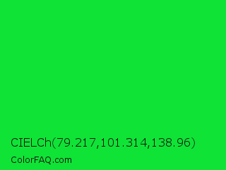CIELCh 79.217,101.314,138.96 Color is a normal green color and the nearest color is Vivid Malachite #00cc33. Hex code #0fe336 and RGB value is rgb(15,227,54). In RGB color space, this color is composed of 6% red, 89% green, 21% blue, In CMYK color space, this color is composed of 93% cyan, 0% magenta, 76% yellow , 11% black , In HSL color space, this color has a hue angle of 131° , 88% saturation and 47% lightness.