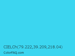 CIELCh 79.222,39.209,218.04 Color is a normal cyan color and the nearest color is Turquoise #40e0d0. Hex code #3bd6f0 and RGB value is rgb(59,214,240). In RGB color space, this color is composed of 23% red, 84% green, 94% blue, In CMYK color space, this color is composed of 75% cyan, 11% magenta, 0% yellow , 6% black , In HSL color space, this color has a hue angle of 189° , 86% saturation and 59% lightness.