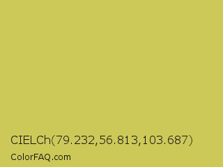 CIELCh 79.232,56.813,103.687 Color is a normal yellow color and the nearest color is Tacha #d6c562. Hex code #ccc959 and RGB value is rgb(204,201,89). In RGB color space, this color is composed of 80% red, 79% green, 35% blue, In CMYK color space, this color is composed of 0% cyan, 1% magenta, 56% yellow , 20% black , In HSL color space, this color has a hue angle of 58° , 53% saturation and 57% lightness.