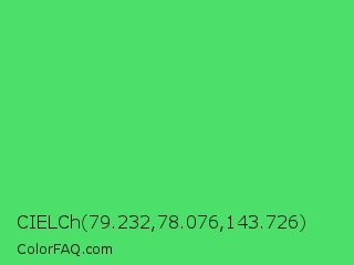 CIELCh 79.232,78.076,143.726 Color is a normal green color and the nearest color is UFO Green #3cd070. Hex code #4cdf69 and RGB value is rgb(76,223,105). In RGB color space, this color is composed of 30% red, 87% green, 41% blue, In CMYK color space, this color is composed of 66% cyan, 0% magenta, 53% yellow , 13% black , In HSL color space, this color has a hue angle of 132° , 70% saturation and 59% lightness.