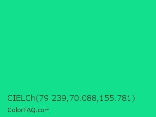 CIELCh 79.239,70.088,155.781 Color is a normal green color and the nearest color is Caribbean Green #00cc99. Hex code #13e08c and RGB value is rgb(19,224,140). In RGB color space, this color is composed of 7% red, 88% green, 55% blue, In CMYK color space, this color is composed of 92% cyan, 0% magenta, 38% yellow , 12% black , In HSL color space, this color has a hue angle of 155° , 84% saturation and 48% lightness.