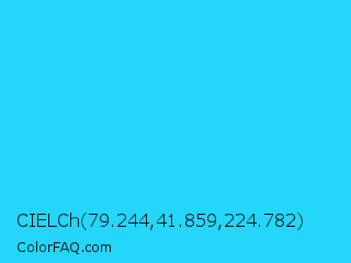 CIELCh 79.244,41.859,224.782 Color is a normal cyan color and the nearest color is Spiro Disco Ball #0fc0fc. Hex code #23d6fa and RGB value is rgb(35,214,250). In RGB color space, this color is composed of 14% red, 84% green, 98% blue, In CMYK color space, this color is composed of 86% cyan, 14% magenta, 0% yellow , 2% black , In HSL color space, this color has a hue angle of 190° , 96% saturation and 56% lightness.