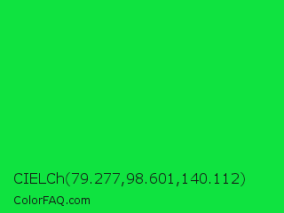 CIELCh 79.277,98.601,140.112 Color is a normal green color and the nearest color is Malachite #0bda51. Hex code #0fe340 and RGB value is rgb(15,227,64). In RGB color space, this color is composed of 6% red, 89% green, 25% blue, In CMYK color space, this color is composed of 93% cyan, 0% magenta, 72% yellow , 11% black , In HSL color space, this color has a hue angle of 134° , 88% saturation and 47% lightness.