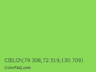 CIELCh 79.308,72.519,130.709 Color is a normal green color and the nearest color is Kiwi #8ee53f. Hex code #87d957 and RGB value is rgb(135,217,87). In RGB color space, this color is composed of 53% red, 85% green, 34% blue, In CMYK color space, this color is composed of 38% cyan, 0% magenta, 60% yellow , 15% black , In HSL color space, this color has a hue angle of 98° , 63% saturation and 60% lightness.