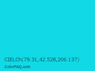 CIELCh 79.31,42.528,206.137 Color is a normal cyan color and the nearest color is Bright Turquoise #08e8de. Hex code #12d9e6 and RGB value is rgb(18,217,230). In RGB color space, this color is composed of 7% red, 85% green, 90% blue, In CMYK color space, this color is composed of 92% cyan, 6% magenta, 0% yellow , 10% black , In HSL color space, this color has a hue angle of 184° , 85% saturation and 49% lightness.