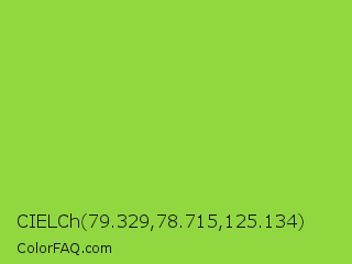 CIELCh 79.329,78.715,125.134 Color is a normal green color and the nearest color is Kiwi #8ee53f. Hex code #91d840 and RGB value is rgb(145,216,64). In RGB color space, this color is composed of 57% red, 85% green, 25% blue, In CMYK color space, this color is composed of 33% cyan, 0% magenta, 70% yellow , 15% black , In HSL color space, this color has a hue angle of 88° , 66% saturation and 55% lightness.