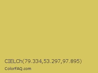 CIELCh 79.334,53.297,97.895 Color is a light yellow color and the nearest color is Tacha #d6c562. Hex code #d6c65f and RGB value is rgb(214,198,95). In RGB color space, this color is composed of 84% red, 78% green, 37% blue, In CMYK color space, this color is composed of 0% cyan, 7% magenta, 56% yellow , 16% black , In HSL color space, this color has a hue angle of 52° , 59% saturation and 61% lightness.