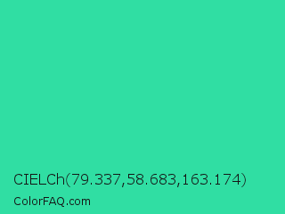 CIELCh 79.337,58.683,163.174 Color is a normal green color and the nearest color is Shamrock #33cc99. Hex code #30dea3 and RGB value is rgb(48,222,163). In RGB color space, this color is composed of 19% red, 87% green, 64% blue, In CMYK color space, this color is composed of 78% cyan, 0% magenta, 27% yellow , 13% black , In HSL color space, this color has a hue angle of 160° , 73% saturation and 53% lightness.