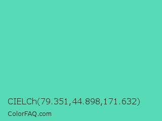 CIELCh 79.351,44.898,171.632 Color is a normal cyan color and the nearest color is Medium Aquamarine #66ddaa. Hex code #56dab7 and RGB value is rgb(86,218,183). In RGB color space, this color is composed of 34% red, 85% green, 72% blue, In CMYK color space, this color is composed of 61% cyan, 0% magenta, 16% yellow , 15% black , In HSL color space, this color has a hue angle of 164° , 64% saturation and 60% lightness.