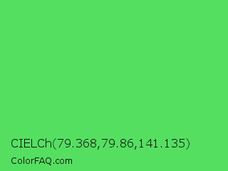 CIELCh 79.368,79.86,141.135 Color is a normal green color and the nearest color is UFO Green #3cd070. Hex code #55df61 and RGB value is rgb(85,223,97). In RGB color space, this color is composed of 33% red, 87% green, 38% blue, In CMYK color space, this color is composed of 62% cyan, 0% magenta, 57% yellow , 13% black , In HSL color space, this color has a hue angle of 125° , 68% saturation and 60% lightness.