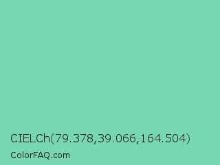 CIELCh 79.378,39.066,164.504 Color is a light green color and the nearest color is Medium Aquamarine #66ddaa. Hex code #76d7b0 and RGB value is rgb(118,215,176). In RGB color space, this color is composed of 46% red, 84% green, 69% blue, In CMYK color space, this color is composed of 45% cyan, 0% magenta, 18% yellow , 16% black , In HSL color space, this color has a hue angle of 156° , 55% saturation and 65% lightness.