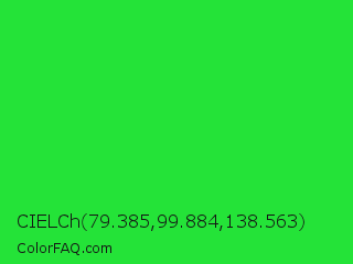 CIELCh 79.385,99.884,138.563 Color is a normal green color and the nearest color is Lime Green #32cd32. Hex code #24e338 and RGB value is rgb(36,227,56). In RGB color space, this color is composed of 14% red, 89% green, 22% blue, In CMYK color space, this color is composed of 84% cyan, 0% magenta, 75% yellow , 11% black , In HSL color space, this color has a hue angle of 126° , 77% saturation and 52% lightness.