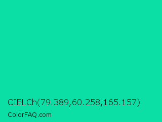 CIELCh 79.389,60.258,165.157 Color is a normal cyan color and the nearest color is Caribbean Green #00cc99. Hex code #0cdfa6 and RGB value is rgb(12,223,166). In RGB color space, this color is composed of 5% red, 87% green, 65% blue, In CMYK color space, this color is composed of 95% cyan, 0% magenta, 26% yellow , 13% black , In HSL color space, this color has a hue angle of 164° , 90% saturation and 46% lightness.
