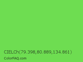 CIELCh 79.398,80.889,134.861 Color is a normal green color and the nearest color is Mantis #74c365. Hex code #6edd51 and RGB value is rgb(110,221,81). In RGB color space, this color is composed of 43% red, 87% green, 32% blue, In CMYK color space, this color is composed of 50% cyan, 0% magenta, 63% yellow , 13% black , In HSL color space, this color has a hue angle of 108° , 67% saturation and 59% lightness.