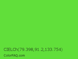 CIELCh 79.398,91.2,133.754 Color is a normal green color and the nearest color is Kiwi #8ee53f. Hex code #61df3a and RGB value is rgb(97,223,58). In RGB color space, this color is composed of 38% red, 87% green, 23% blue, In CMYK color space, this color is composed of 57% cyan, 0% magenta, 74% yellow , 13% black , In HSL color space, this color has a hue angle of 106° , 72% saturation and 55% lightness.