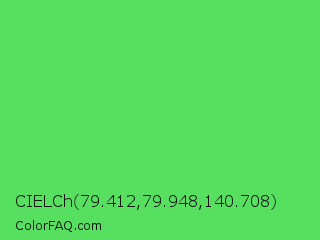 CIELCh 79.412,79.948,140.708 Color is a light green color and the nearest color is Emerald #50c878. Hex code #57df60 and RGB value is rgb(87,223,96). In RGB color space, this color is composed of 34% red, 87% green, 38% blue, In CMYK color space, this color is composed of 61% cyan, 0% magenta, 57% yellow , 13% black , In HSL color space, this color has a hue angle of 124° , 68% saturation and 61% lightness.