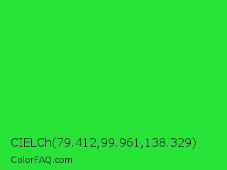 CIELCh 79.412,99.961,138.329 Color is a normal green color and the nearest color is Lime Green #32cd32. Hex code #27e337 and RGB value is rgb(39,227,55). In RGB color space, this color is composed of 15% red, 89% green, 22% blue, In CMYK color space, this color is composed of 83% cyan, 0% magenta, 76% yellow , 11% black , In HSL color space, this color has a hue angle of 125° , 77% saturation and 52% lightness.