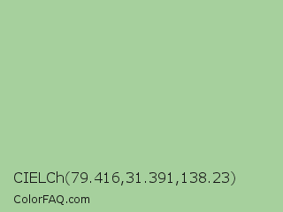 CIELCh 79.416,31.391,138.23 Color is a light green color and the nearest color is Eton Blue #96c8a2. Hex code #a6d09d and RGB value is rgb(166,208,157). In RGB color space, this color is composed of 65% red, 82% green, 62% blue, In CMYK color space, this color is composed of 20% cyan, 0% magenta, 25% yellow , 18% black , In HSL color space, this color has a hue angle of 109° , 35% saturation and 72% lightness.
