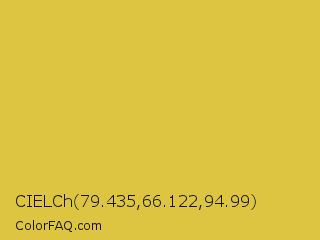 CIELCh 79.435,66.122,94.99 Color is a normal yellow color and the nearest color is Anzac #e0b646. Hex code #ddc541 and RGB value is rgb(221,197,65). In RGB color space, this color is composed of 87% red, 77% green, 25% blue, In CMYK color space, this color is composed of 0% cyan, 11% magenta, 71% yellow , 13% black , In HSL color space, this color has a hue angle of 51° , 70% saturation and 56% lightness.