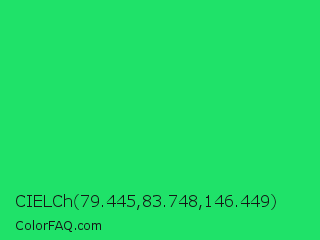 CIELCh 79.445,83.748,146.449 Color is a normal green color and the nearest color is Malachite #0bda51. Hex code #1fe269 and RGB value is rgb(31,226,105). In RGB color space, this color is composed of 12% red, 89% green, 41% blue, In CMYK color space, this color is composed of 86% cyan, 0% magenta, 54% yellow , 11% black , In HSL color space, this color has a hue angle of 143° , 77% saturation and 50% lightness.