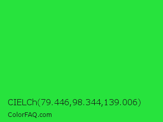 CIELCh 79.446,98.344,139.006 Color is a normal green color and the nearest color is Lime Green #32cd32. Hex code #27e33d and RGB value is rgb(39,227,61). In RGB color space, this color is composed of 15% red, 89% green, 24% blue, In CMYK color space, this color is composed of 83% cyan, 0% magenta, 73% yellow , 11% black , In HSL color space, this color has a hue angle of 127° , 77% saturation and 52% lightness.