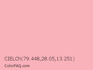 CIELCh 79.448,28.05,13.251 Color is a very light red color and the nearest color is Sundown #ffb1b3. Hex code #fab2ba and RGB value is rgb(250,178,186). In RGB color space, this color is composed of 98% red, 70% green, 73% blue, In CMYK color space, this color is composed of 0% cyan, 29% magenta, 26% yellow , 2% black , In HSL color space, this color has a hue angle of 353° , 88% saturation and 84% lightness.