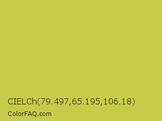 CIELCh 79.497,65.195,106.18 Color is a normal yellow color and the nearest color is Turmeric #cabb48. Hex code #c7cc48 and RGB value is rgb(199,204,72). In RGB color space, this color is composed of 78% red, 80% green, 28% blue, In CMYK color space, this color is composed of 2% cyan, 0% magenta, 65% yellow , 20% black , In HSL color space, this color has a hue angle of 62° , 56% saturation and 54% lightness.