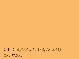 CIELCh 79.4,51.378,72.334 Color is a light orange color and the nearest color is Rajah #f7b668. Hex code #fab869 and RGB value is rgb(250,184,105). In RGB color space, this color is composed of 98% red, 72% green, 41% blue, In CMYK color space, this color is composed of 0% cyan, 26% magenta, 58% yellow , 2% black , In HSL color space, this color has a hue angle of 33° , 94% saturation and 70% lightness.