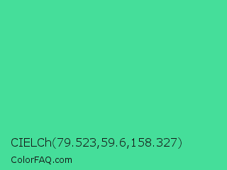 CIELCh 79.523,59.6,158.327 Color is a normal green color and the nearest color is Eucalyptus #44d7a8. Hex code #45de9a and RGB value is rgb(69,222,154). In RGB color space, this color is composed of 27% red, 87% green, 60% blue, In CMYK color space, this color is composed of 69% cyan, 0% magenta, 31% yellow , 13% black , In HSL color space, this color has a hue angle of 153° , 70% saturation and 57% lightness.
