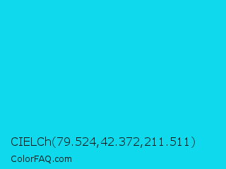 CIELCh 79.524,42.372,211.511 Color is a normal cyan color and the nearest color is Bright Turquoise #08e8de. Hex code #0fd9ed and RGB value is rgb(15,217,237). In RGB color space, this color is composed of 6% red, 85% green, 93% blue, In CMYK color space, this color is composed of 94% cyan, 8% magenta, 0% yellow , 7% black , In HSL color space, this color has a hue angle of 185° , 88% saturation and 49% lightness.