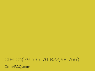 CIELCh 79.535,70.822,98.766 Color is a normal yellow color and the nearest color is Earls Green #c9b93b. Hex code #d6c835 and RGB value is rgb(214,200,53). In RGB color space, this color is composed of 84% red, 78% green, 21% blue, In CMYK color space, this color is composed of 0% cyan, 7% magenta, 75% yellow , 16% black , In HSL color space, this color has a hue angle of 55° , 66% saturation and 52% lightness.