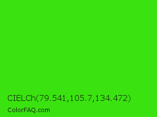 CIELCh 79.541,105.7,134.472 Color is a normal green color and the nearest color is Harlequin Green #46cb18. Hex code #3ae30f and RGB value is rgb(58,227,15). In RGB color space, this color is composed of 23% red, 89% green, 6% blue, In CMYK color space, this color is composed of 74% cyan, 0% magenta, 93% yellow , 11% black , In HSL color space, this color has a hue angle of 108° , 88% saturation and 47% lightness.