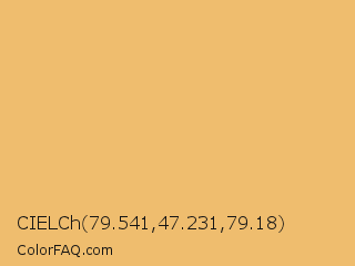 CIELCh 79.541,47.231,79.18 Color is a light orange color and the nearest color is Rob Roy #eac674. Hex code #efbd6e and RGB value is rgb(239,189,110). In RGB color space, this color is composed of 94% red, 74% green, 43% blue, In CMYK color space, this color is composed of 0% cyan, 21% magenta, 54% yellow , 6% black , In HSL color space, this color has a hue angle of 37° , 80% saturation and 68% lightness.