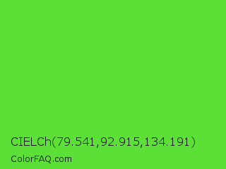 CIELCh 79.541,92.915,134.191 Color is a normal green color and the nearest color is Harlequin Green #46cb18. Hex code #5ce038 and RGB value is rgb(92,224,56). In RGB color space, this color is composed of 36% red, 88% green, 22% blue, In CMYK color space, this color is composed of 59% cyan, 0% magenta, 75% yellow , 12% black , In HSL color space, this color has a hue angle of 107° , 73% saturation and 55% lightness.
