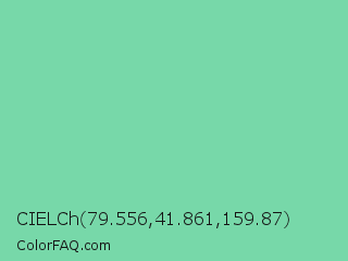 CIELCh 79.556,41.861,159.87 Color is a light green color and the nearest color is Medium Aquamarine #66ddaa. Hex code #77d8a9 and RGB value is rgb(119,216,169). In RGB color space, this color is composed of 47% red, 85% green, 66% blue, In CMYK color space, this color is composed of 45% cyan, 0% magenta, 22% yellow , 15% black , In HSL color space, this color has a hue angle of 151° , 55% saturation and 66% lightness.