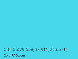 CIELCh 79.558,37.911,213.571 Color is a normal cyan color and the nearest color is Turquoise #40e0d0. Hex code #46d7eb and RGB value is rgb(70,215,235). In RGB color space, this color is composed of 27% red, 84% green, 92% blue, In CMYK color space, this color is composed of 70% cyan, 9% magenta, 0% yellow , 8% black , In HSL color space, this color has a hue angle of 187° , 80% saturation and 60% lightness.
