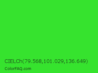 CIELCh 79.568,101.029,136.649 Color is a normal green color and the nearest color is Lime Green #32cd32. Hex code #36e32e and RGB value is rgb(54,227,46). In RGB color space, this color is composed of 21% red, 89% green, 18% blue, In CMYK color space, this color is composed of 76% cyan, 0% magenta, 80% yellow , 11% black , In HSL color space, this color has a hue angle of 117° , 76% saturation and 54% lightness.