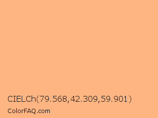 CIELCh 79.568,42.309,59.901 Color is a light orange color and the nearest color is Macaroni And Cheese #ffb97b. Hex code #ffb582 and RGB value is rgb(255,181,130). In RGB color space, this color is composed of 100% red, 71% green, 51% blue, In CMYK color space, this color is composed of 0% cyan, 29% magenta, 49% yellow , 0% black , In HSL color space, this color has a hue angle of 24° , 100% saturation and 75% lightness.