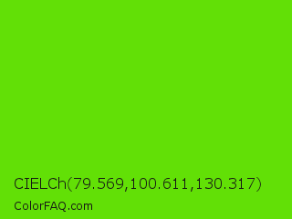 CIELCh 79.569,100.611,130.317 Color is a normal green color and the nearest color is Bright Green #66ff00. Hex code #62e006 and RGB value is rgb(98,224,6). In RGB color space, this color is composed of 38% red, 88% green, 2% blue, In CMYK color space, this color is composed of 56% cyan, 0% magenta, 97% yellow , 12% black , In HSL color space, this color has a hue angle of 95° , 95% saturation and 45% lightness.