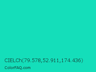 CIELCh 79.578,52.911,174.436 Color is a normal cyan color and the nearest color is Java #1fc2c2. Hex code #14deba and RGB value is rgb(20,222,186). In RGB color space, this color is composed of 8% red, 87% green, 73% blue, In CMYK color space, this color is composed of 91% cyan, 0% magenta, 16% yellow , 13% black , In HSL color space, this color has a hue angle of 169° , 83% saturation and 47% lightness.