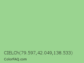 CIELCh 79.597,42.049,138.533 Color is a light green color and the nearest color is Feijoa #9fdd8c. Hex code #9ad490 and RGB value is rgb(154,212,144). In RGB color space, this color is composed of 60% red, 83% green, 56% blue, In CMYK color space, this color is composed of 27% cyan, 0% magenta, 32% yellow , 17% black , In HSL color space, this color has a hue angle of 111° , 44% saturation and 70% lightness.