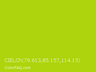 CIELCh 79.613,85.157,114.13 Color is a normal lime color and the nearest color is Vivid Lime Green #a6d608. Hex code #add40c and RGB value is rgb(173,212,12). In RGB color space, this color is composed of 68% red, 83% green, 5% blue, In CMYK color space, this color is composed of 18% cyan, 0% magenta, 94% yellow , 17% black , In HSL color space, this color has a hue angle of 72° , 89% saturation and 44% lightness.