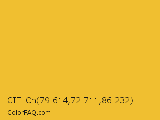 CIELCh 79.614,72.711,86.232 Color is a normal orange color and the nearest color is Saffron #f4c430. Hex code #f0bf30 and RGB value is rgb(240,191,48). In RGB color space, this color is composed of 94% red, 75% green, 19% blue, In CMYK color space, this color is composed of 0% cyan, 20% magenta, 80% yellow , 6% black , In HSL color space, this color has a hue angle of 45° , 86% saturation and 56% lightness.