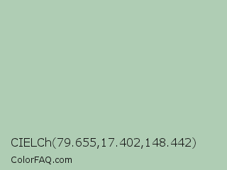 CIELCh 79.655,17.402,148.442 Color is a light green color and the nearest color is Spring Rain #accbb1. Hex code #afcdb4 and RGB value is rgb(175,205,180). In RGB color space, this color is composed of 69% red, 80% green, 71% blue, In CMYK color space, this color is composed of 15% cyan, 0% magenta, 12% yellow , 20% black , In HSL color space, this color has a hue angle of 130° , 23% saturation and 75% lightness.