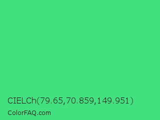 CIELCh 79.65,70.859,149.951 Color is a normal green color and the nearest color is UFO Green #3cd070. Hex code #43e080 and RGB value is rgb(67,224,128). In RGB color space, this color is composed of 26% red, 88% green, 50% blue, In CMYK color space, this color is composed of 70% cyan, 0% magenta, 43% yellow , 12% black , In HSL color space, this color has a hue angle of 143° , 72% saturation and 57% lightness.