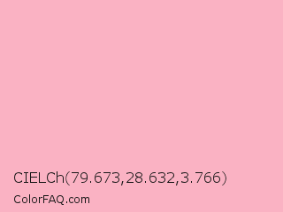 CIELCh 79.673,28.632,3.766 Color is a very light red color and the nearest color is Light Pink #ffb6c1. Hex code #fab2c3 and RGB value is rgb(250,178,195). In RGB color space, this color is composed of 98% red, 70% green, 76% blue, In CMYK color space, this color is composed of 0% cyan, 29% magenta, 22% yellow , 2% black , In HSL color space, this color has a hue angle of 346° , 88% saturation and 84% lightness.