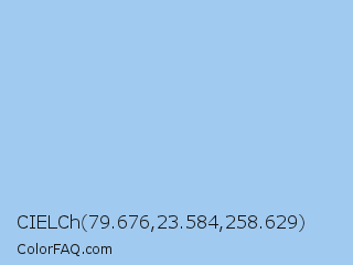 CIELCh 79.676,23.584,258.629 Color is a light blue color and the nearest color is Baby Blue Eyes #a1caf1. Hex code #a1caf0 and RGB value is rgb(161,202,240). In RGB color space, this color is composed of 63% red, 79% green, 94% blue, In CMYK color space, this color is composed of 33% cyan, 16% magenta, 0% yellow , 6% black , In HSL color space, this color has a hue angle of 209° , 72% saturation and 79% lightness.