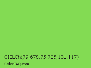 CIELCh 79.678,75.725,131.117 Color is a normal green color and the nearest color is Kiwi #8ee53f. Hex code #83db53 and RGB value is rgb(131,219,83). In RGB color space, this color is composed of 51% red, 86% green, 33% blue, In CMYK color space, this color is composed of 40% cyan, 0% magenta, 62% yellow , 14% black , In HSL color space, this color has a hue angle of 99° , 65% saturation and 59% lightness.