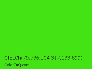 CIELCh 79.736,104.317,133.899 Color is a normal green color and the nearest color is Harlequin Green #46cb18. Hex code #44e313 and RGB value is rgb(68,227,19). In RGB color space, this color is composed of 27% red, 89% green, 7% blue, In CMYK color space, this color is composed of 70% cyan, 0% magenta, 92% yellow , 11% black , In HSL color space, this color has a hue angle of 106° , 85% saturation and 48% lightness.